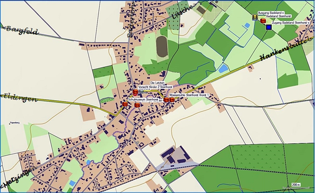 Als zweites um das Hinweisschild auf den UTM-Koordinaten 32 U 590655 5844011 für das Schulmuseum in Steinhorst, welches in einen Fachwerhaus aus den 17. bis 18.Jahrhundert untergebracht ist, über den Bedarfsweg in Richtung Räderloh zur dortigen Kreisstraße in Richtung Steinhorst.