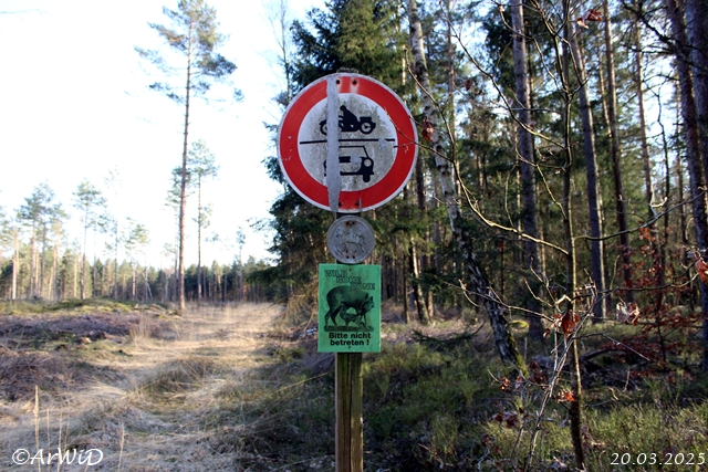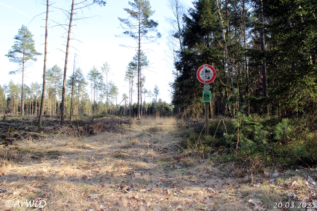Neben dem allgemeinen alte beschädigte Verbotsschild für Kraftfahrzeuge, für Reiter als auch das Hinweisschild auf die Wildruhezone zum Schutz der Wildtiere angebracht.