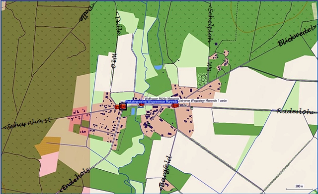 Als erstes ist das die Wolfhagen-Mühle auf den UTM-Koordinaten 32 U 590398 5844020 in der Endeholzer Straße mit den Hinweisschild auf dem Betreten der Fläche vor der Mühle auf eigene Gefahr und den Verbotsschild für das Betreten neben bzw. hinter dem Mühlengebäude.