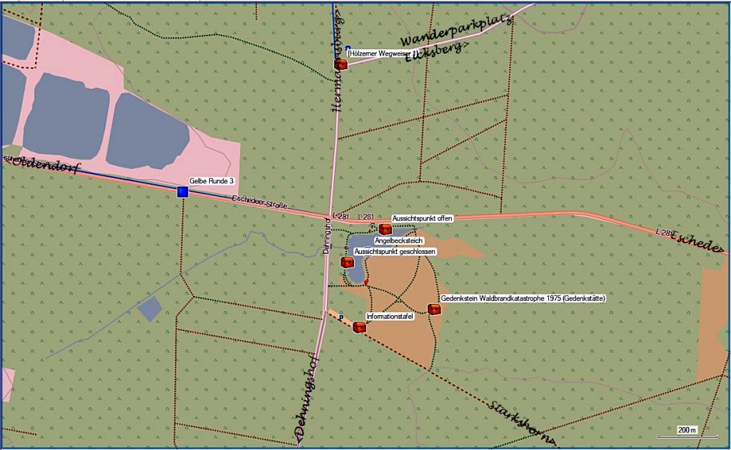 Dieser Teich ist ein Stausee bzw. ein Feuerlöschteich, der durch das Aufstauen der Angelbeck, nach dem großen Waldbrand von August 1975 in diesen Bereich eingerichtet wurde.