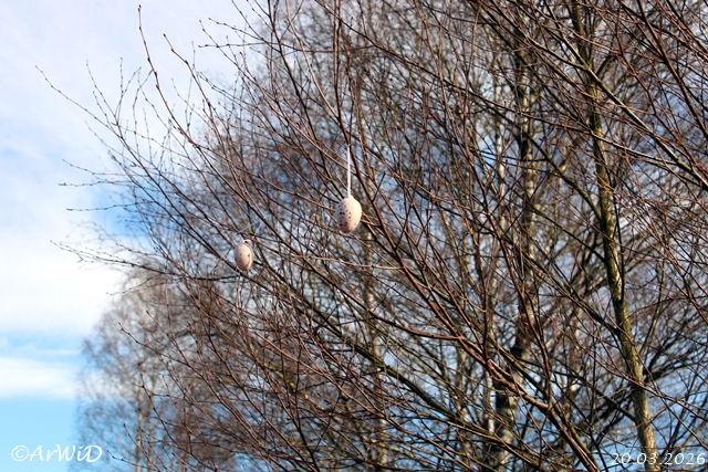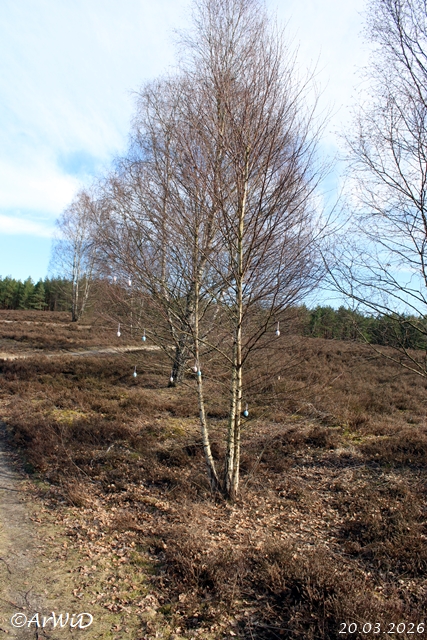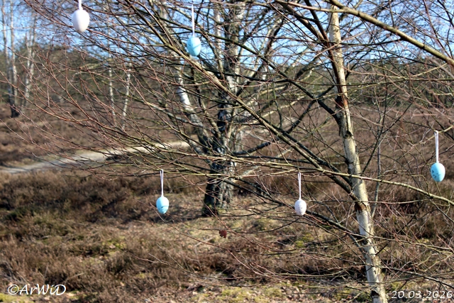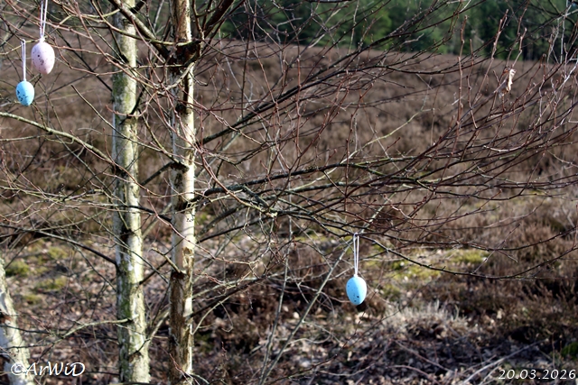 Hier steht ein kleiner Busch mit ein paar Dekoeier in den Ästen auf der Heidefläche an einen der dortigen Laufwege.