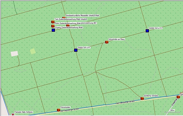 In den Waldstück hinter dem Wegweiser befindet sich ein eingezäunter Bereich der gemäß dazugehörigen Infotafel die Umweltbelastung des Boden durch die Universität Göttingen genutzt bzw. überwacht wird.