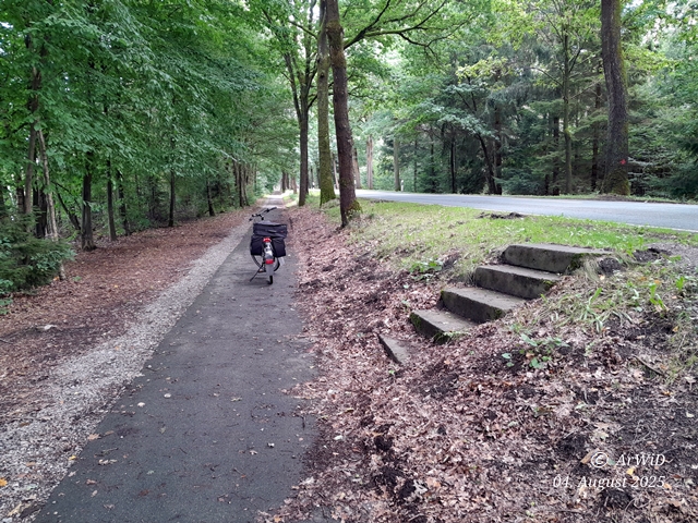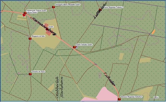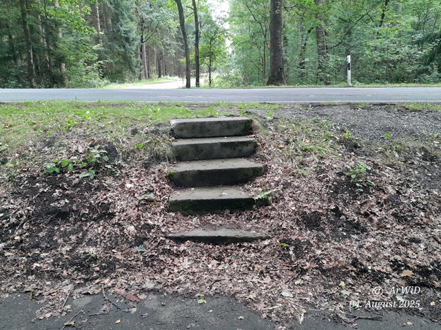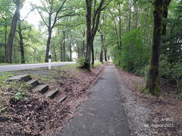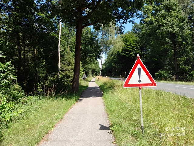 An des dortigen Radweg am der dortigen Landesstraße von Beckedorf nach Eschede ging es in der Höhe der Kiesgrube von Oldendorf auf den UTM-Koordinaten 32 U 574371 5849941 als Übergang zu einen Stichweg in den Wald.