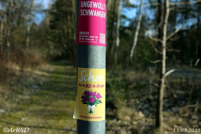 Zusätzlich sind auch die Aufkleber auf dem Pfahl des Wegweisers des ADFC sehr interessant und abwechselsreich in ihrer Thematik.